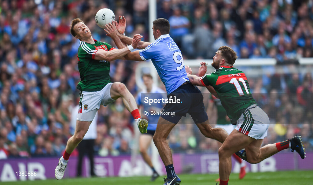 17 September 2017; James McCarthy of Dublin in action against Donal Vaughan, left, and Aidan O'Shea of Mayo during the GAA Football All-Ireland Senior Championship Final match between Dublin and Mayo at Croke Park in Dublin. Photo by Eóin Noonan/Sportsfile