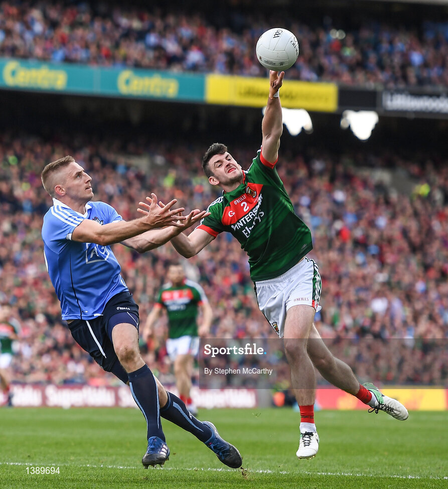 17 September 2017; Eoghan O'Gara of Dublin in action against Brendan Harrison of Mayo during the GAA Football All-Ireland Senior Championship Final match between Dublin and Mayo at Croke Park in Dublin. Photo by Stephen McCarthy/Sportsfile