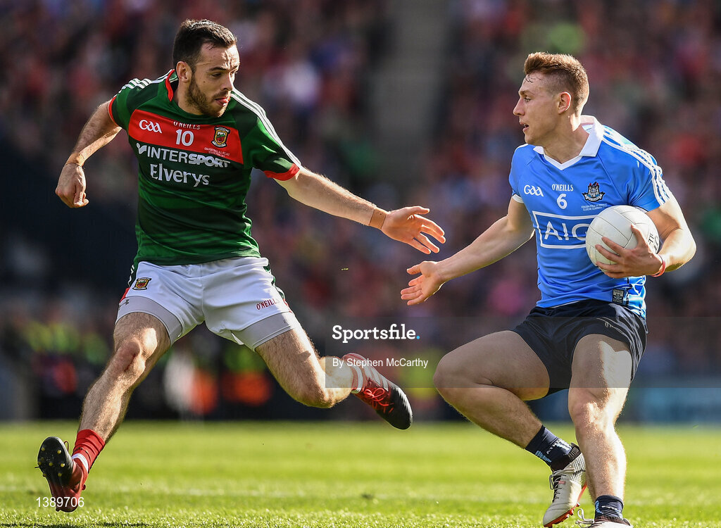 17 September 2017; John Small of Dublin in action against Kevin McLoughlin of Mayo during the GAA Football All-Ireland Senior Championship Final match between Dublin and Mayo at Croke Park in Dublin. Photo by Stephen McCarthy/Sportsfile