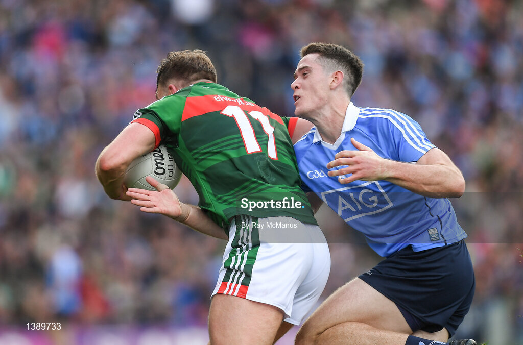 17 September 2017; Aidan O'Shea of Mayo in action against Brian Fenton of Dublin during the GAA Football All-Ireland Senior Championship Final match between Dublin and Mayo at Croke Park in Dublin. Photo by Ray McManus/Sportsfile