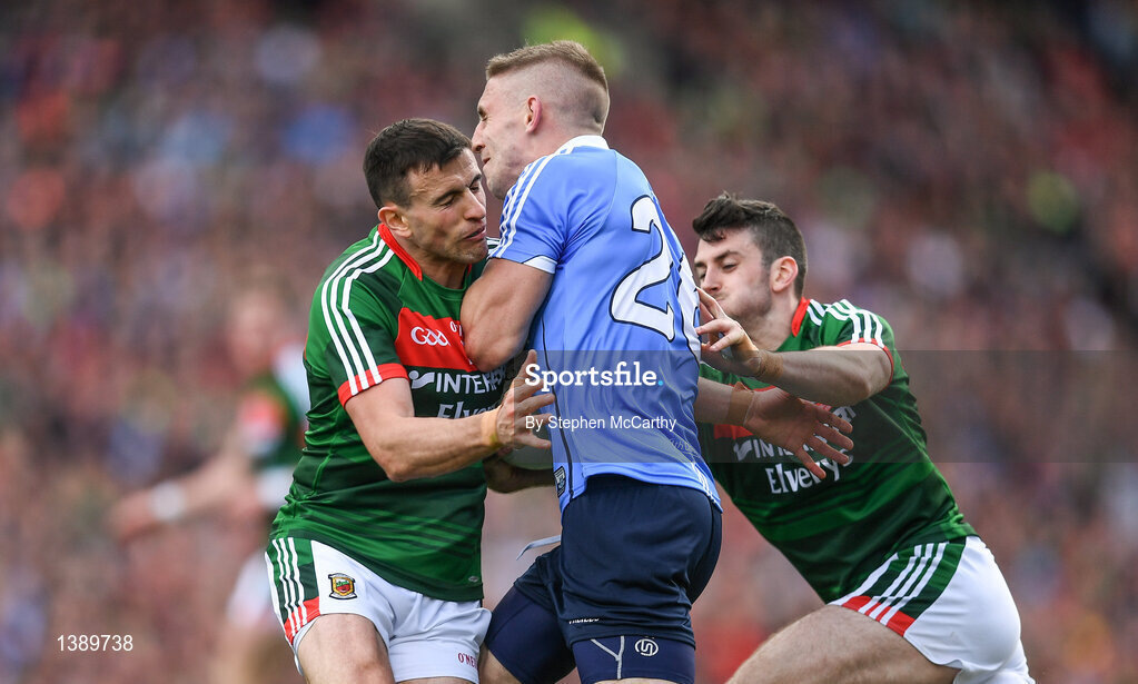 17 September 2017; Eoghan O'Gara of Dublin in action against Jason Doherty, left, and Brendan Harrison of Mayo during the GAA Football All-Ireland Senior Championship Final match between Dublin and Mayo at Croke Park in Dublin.