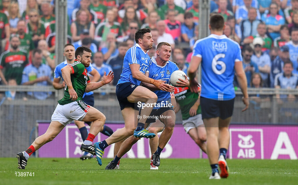 17 September 2017; Paddy Andrews of Dublin collides with team-mate Ciarán Kilkenny resulting in a free for Dublin during the GAA Football All-Ireland Senior Championship Final match between Dublin and Mayo at Croke Park in Dublin. Photo by Brendan Moran/Sportsfile