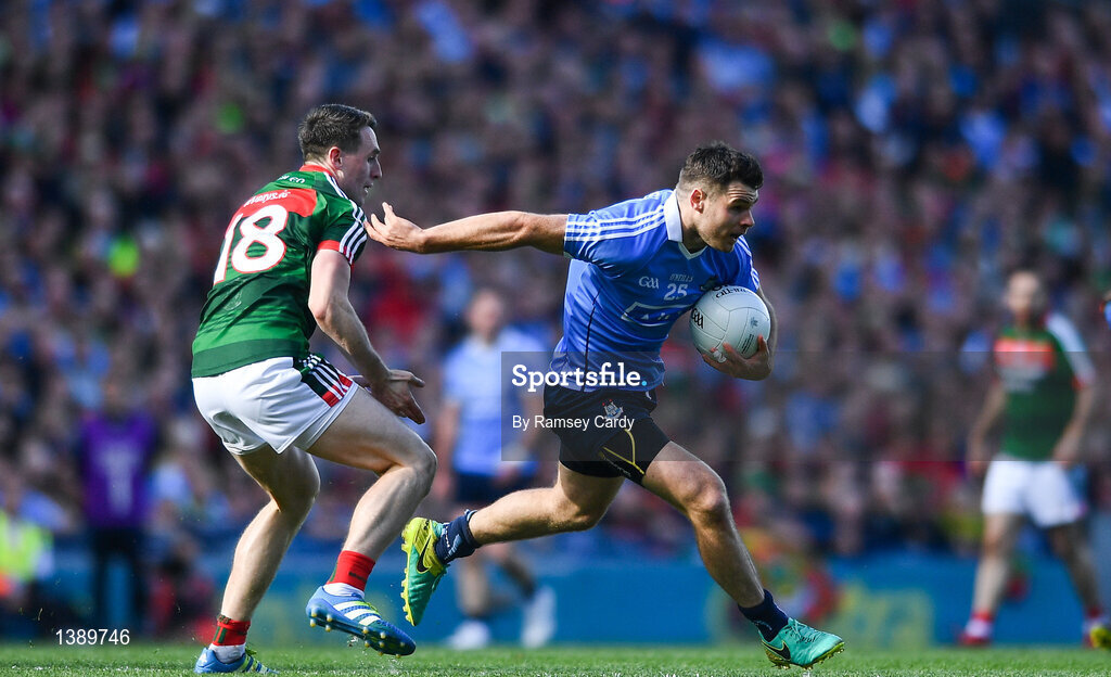 17 September 2017; Kevin McManamon of Dublin is tackled by Paddy Durcan of Mayo during the GAA Football All-Ireland Senior Championship Final match between Dublin and Mayo at Croke Park in Dublin. Photo by Ramsey Cardy/Sportsfile