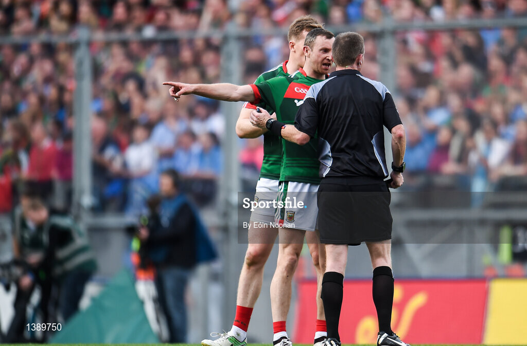 17 September 2017; Keith Higgins of Mayo protests to Referee Joe McQuillan during the GAA Football All-Ireland Senior Championship Final match between Dublin and Mayo at Croke Park in Dublin. Photo by Eóin Noonan/Sportsfile