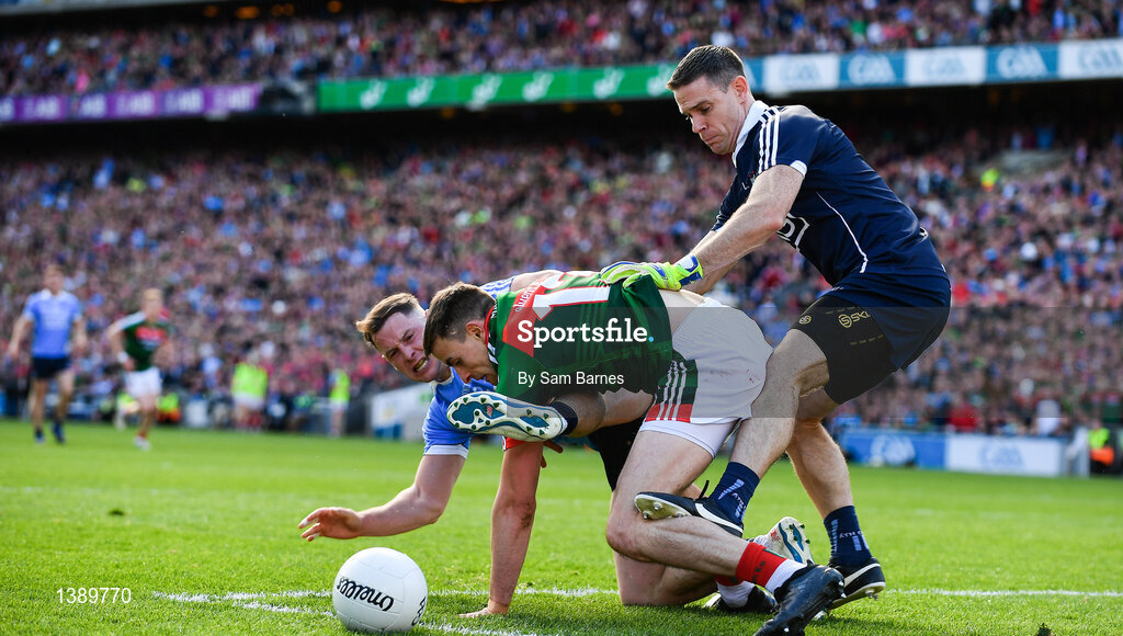 17 September 2017; Jason Doherty of Mayo in action against Stephen Cluxton and Philip McMahon of Dublin during the GAA Football All-Ireland Senior Championship Final match between Dublin and Mayo at Croke Park in Dublin.