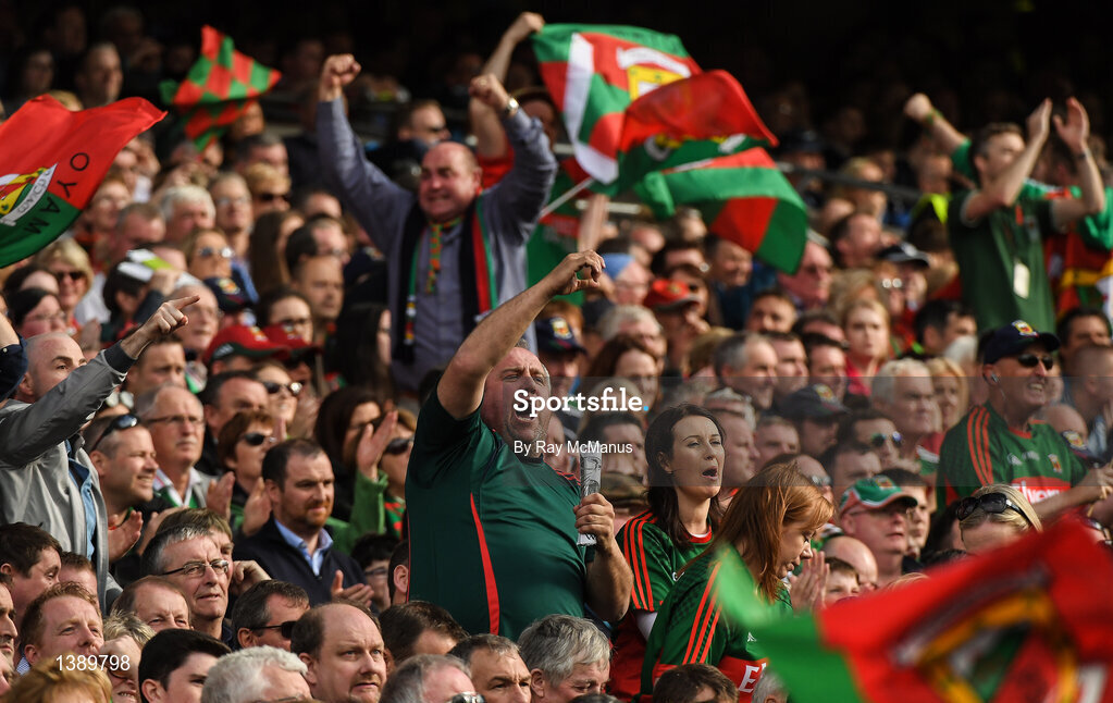 17 September 2017; Mayo supporters in the Cusack Stand celebrate a score during the GAA Football All-Ireland Senior Championship Final match between Dublin and Mayo at Croke Park in Dublin. Photo by Ray McManus/Sportsfile