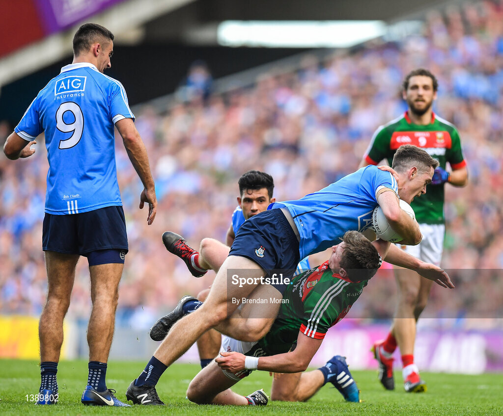 17 September 2017; Brian Fenton of Dublin in action against Cillian O'Connor of Mayo during the GAA Football All-Ireland Senior Championship Final match between Dublin and Mayo at Croke Park in Dublin. Photo by Brendan Moran/Sportsfile