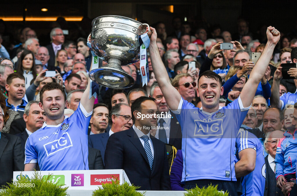 17 September 2017; Dublin's Jack McCaffrey and John Costello with the Sam Maguire after the GAA Football All-Ireland Senior Championship Final match between Dublin and Mayo at Croke Park in Dublin. Photo by Ray McManus/Sportsfile