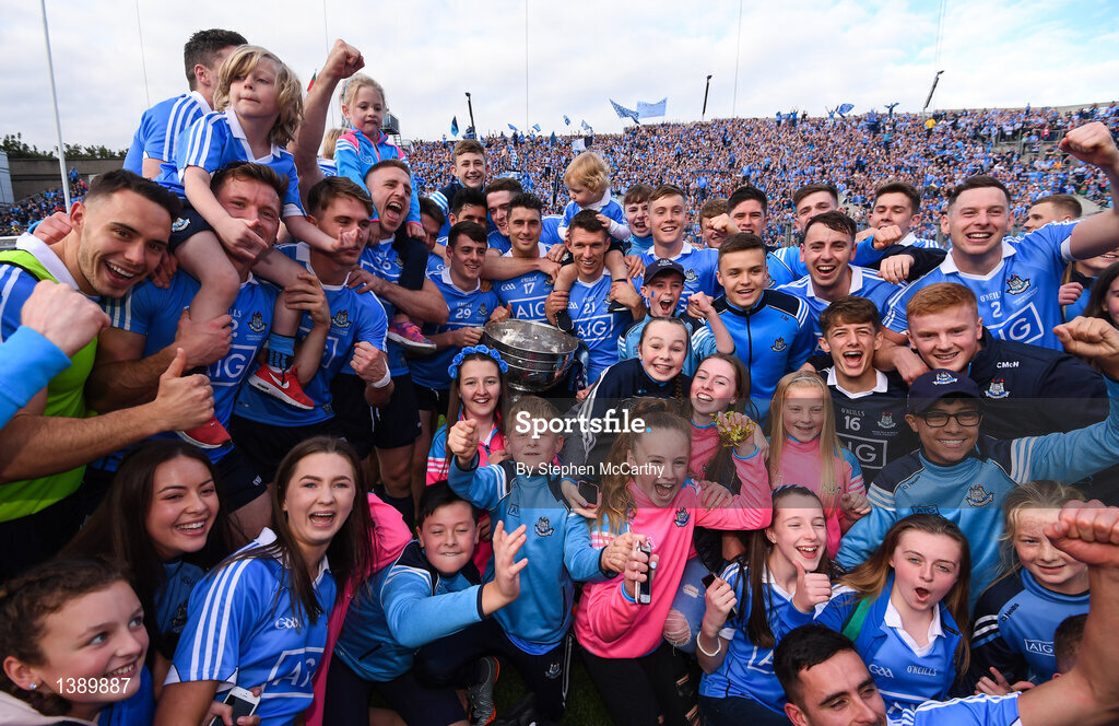 17 September 2017; Dublin players and their family members celebrate with the cup after the GAA Football All-Ireland Senior Championship Final match between Dublin and Mayo at Croke Park in Dublin. Photo by Stephen McCarthy/Sportsfile