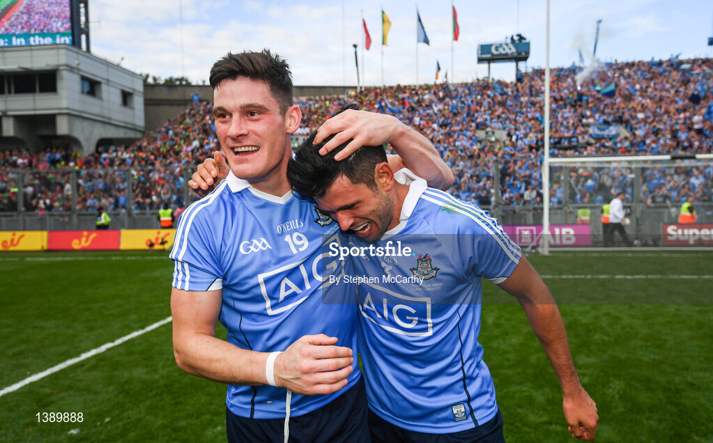 17 September 2017; Diarmuid Connolly, left, and Cian O'Sullivan of Dublin celebrate following the GAA Football All-Ireland Senior Championship Final match between Dublin and Mayo at Croke Park in Dublin. Photo by Stephen McCarthy/Sportsfile