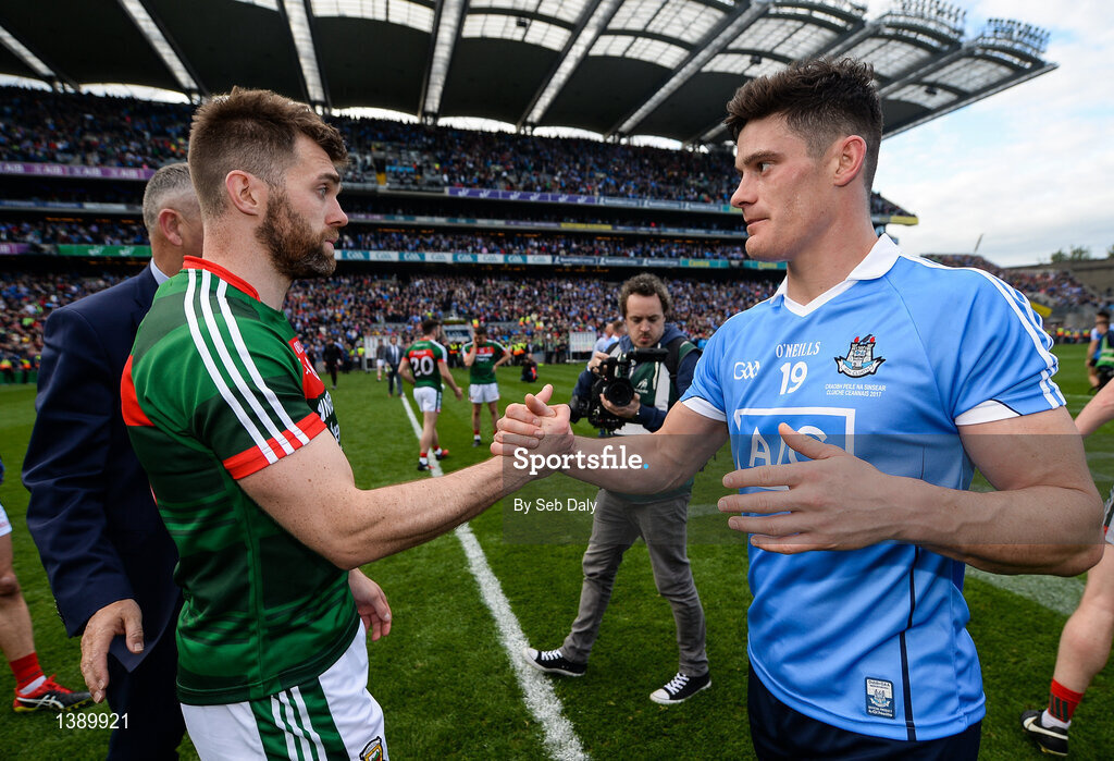 17 September 2017; Séamus O'Shea of Mayo, left, and Diarmuid Connolly of Dublin shake hands following the GAA Football All-Ireland Senior Championship Final match between Dublin and Mayo at Croke Park in Dublin. Photo by Seb Daly/Sportsfile