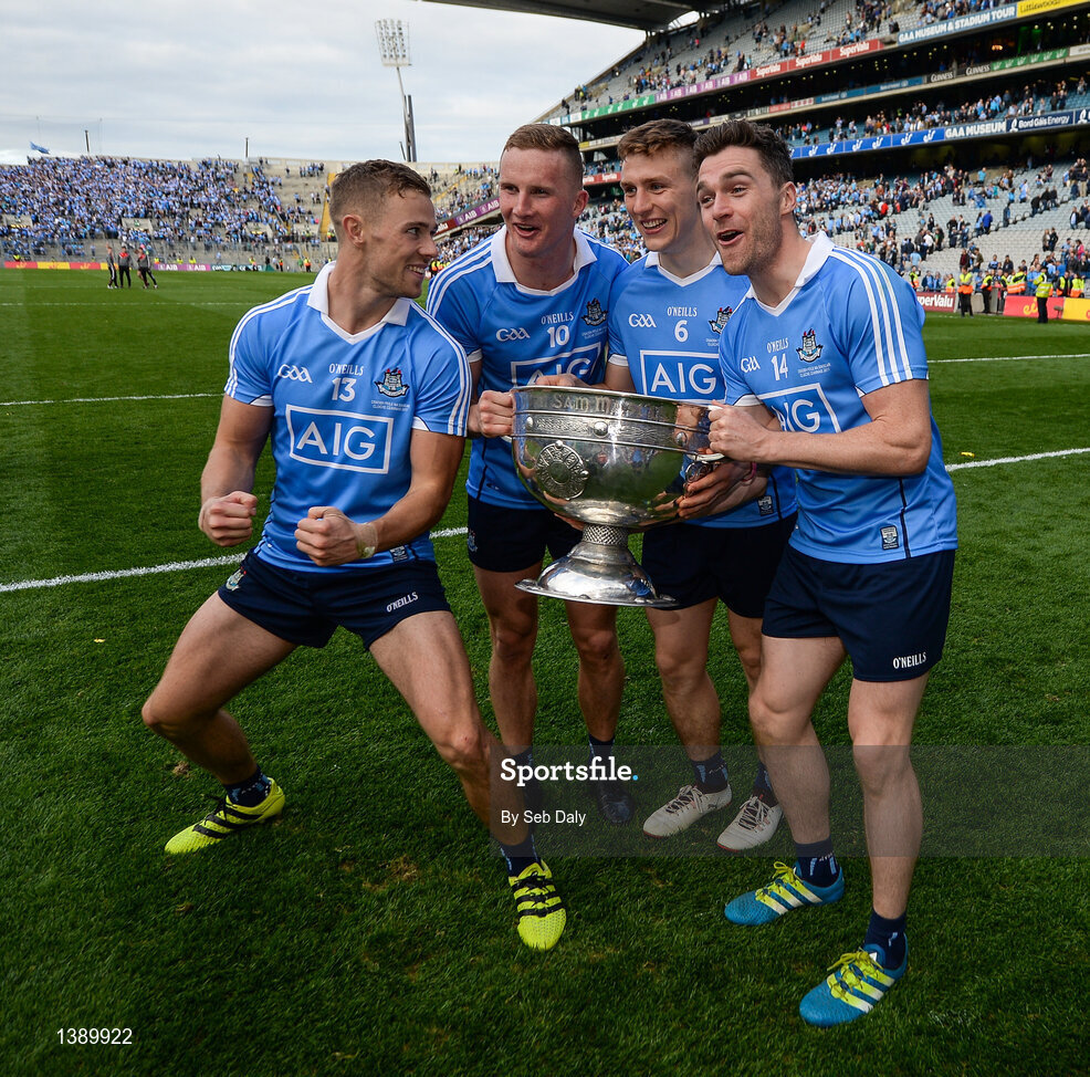 17 September 2017; Dublin players, from left, Paul Mannion, Ciarán Kilkenny, John Small and Paddy Andrews celebrate with the Sam Maguire cup following their side's victory the GAA Football All-Ireland Senior Championship Final match between Dublin and Mayo at Croke Park in Dublin. Photo by Seb Daly/Sportsfile