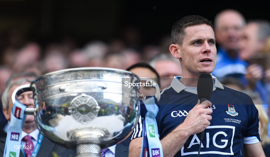 17 September 2017; Dublin captain Stephen Cluxton gives a speech following his side's victory the GAA Football All-Ireland Senior Championship Final match between Dublin and Mayo at Croke Park in Dublin. Photo by Seb Daly/Sportsfile