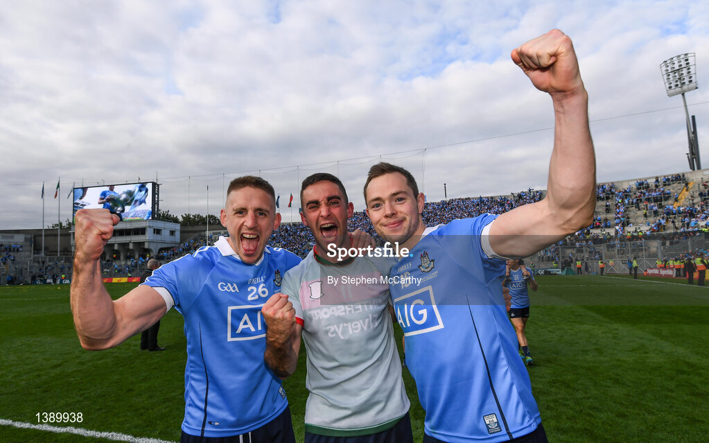 17 September 2017; Dublin players, from left, Eoghan O'Gara, James McCarthy and Dean Rock celebrate following the GAA Football All-Ireland Senior Championship Final match between Dublin and Mayo at Croke Park in Dublin. Photo by Stephen McCarthy/Sportsfile