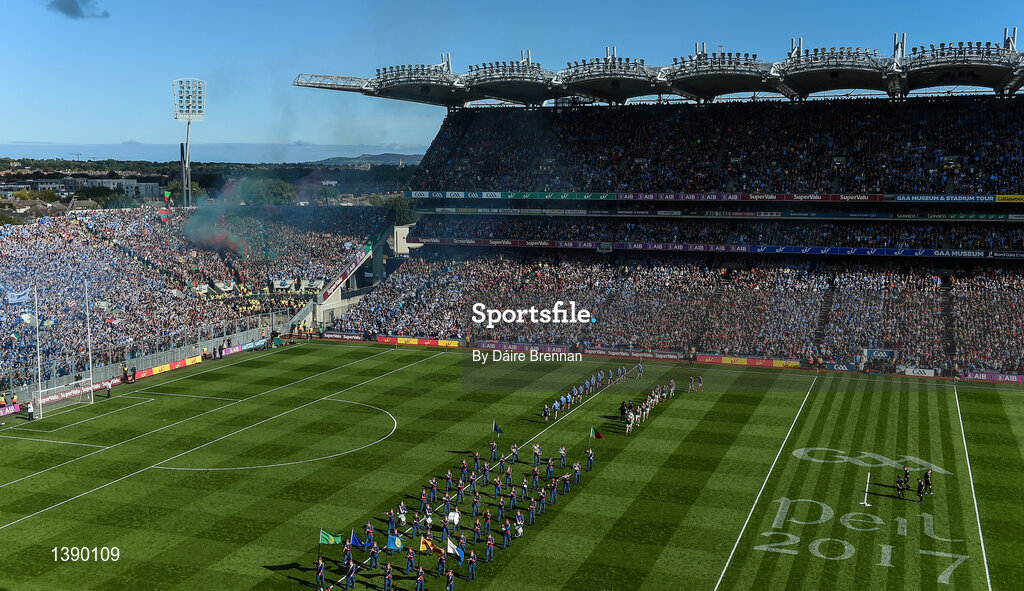 17 September 2017; The Dublin and Mayo teams march behind the Artane School of Music Band ahead of the GAA Football All-Ireland Senior Championship Final match between Dublin and Mayo at Croke Park in Dublin. Photo by Daire Brennan/Sportsfile