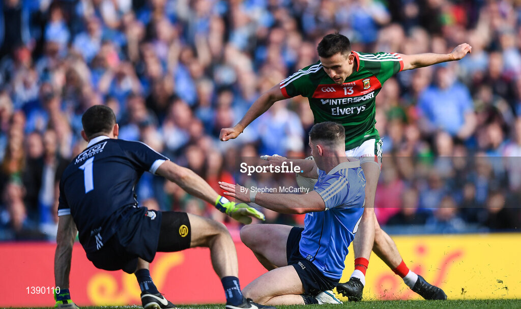 17 September 2017; Jason Doherty of Mayo has a shot on goal blocked by Stephen Cluxton, left, and Philip McMahon of Dublin during the GAA Football All-Ireland Senior Championship Final match between Dublin and Mayo at Croke Park in Dublin. Photo by Stephen McCarthy/Sportsfile
