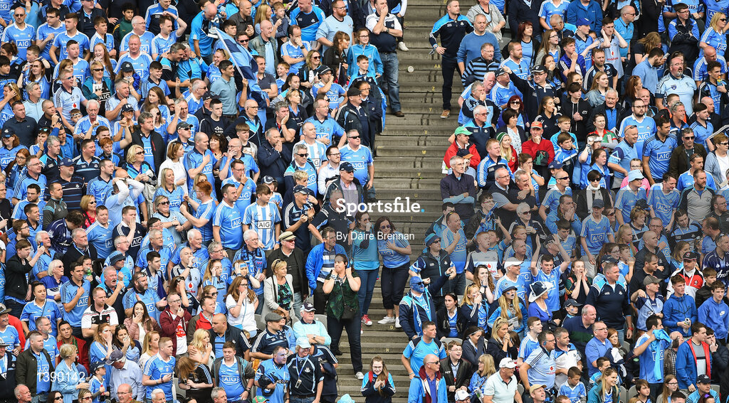 17 September 2017; Dublin supporters in the Cusack Stand anxiously watch the final moments of the GAA Football All-Ireland Senior Championship Final match between Dublin and Mayo at Croke Park in Dublin. Photo by Daire Brennan/Sportsfile