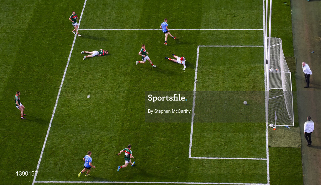 17 September 2017; Con O'Callaghan of Dublin shoots to score his side's first goal past Mayo goalkeeper David Clarke during the GAA Football All-Ireland Senior Championship Final match between Dublin and Mayo at Croke Park in Dublin. Photo by Stephen McCarthy/Sportsfile