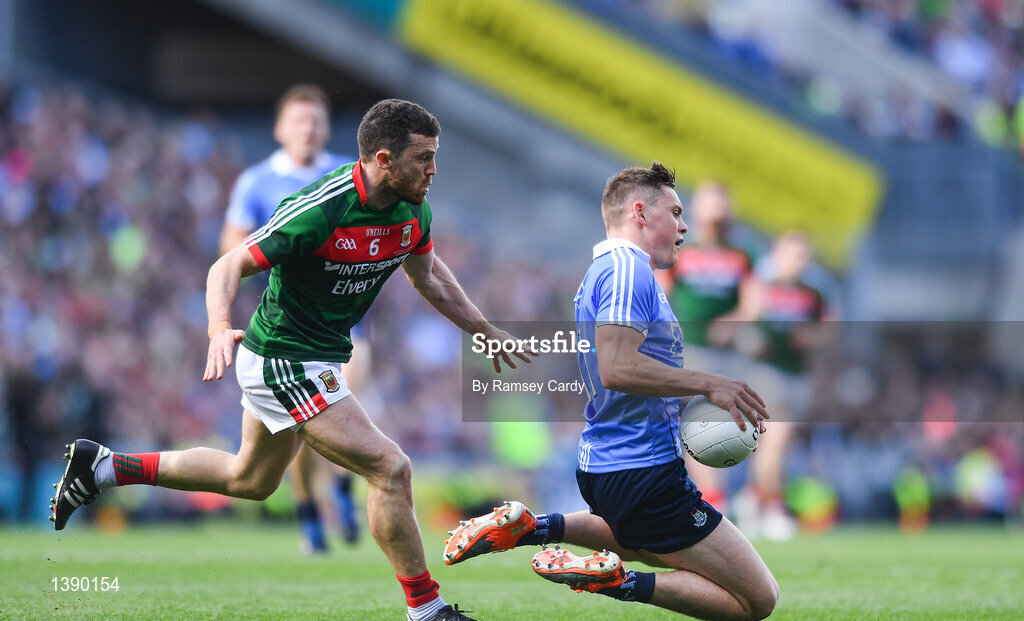 17 September 2017; Con O'Callaghan of Dublin is tackled by Chris Barrett of Mayo during the GAA Football All-Ireland Senior Championship Final match between Dublin and Mayo at Croke Park in Dublin. Photo by Ramsey Cardy/Sportsfile