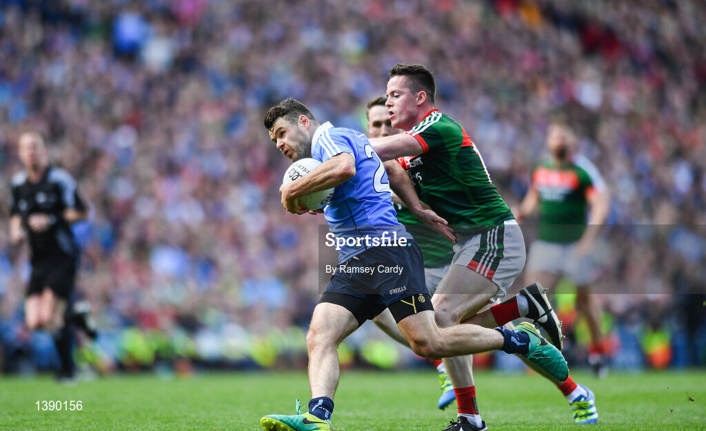 17 September 2017; Kevin McManamon of Dublin in action against Stephen Coen of Mayo during the GAA Football All-Ireland Senior Championship Final match between Dublin and Mayo at Croke Park in Dublin. Photo by Ramsey Cardy/Sportsfile