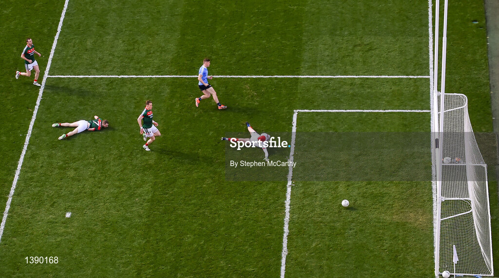 17 September 2017; Con O'Callaghan of Dublin shoots to score his side's first goal past Mayo goalkeeper David Clarke during the GAA Football All-Ireland Senior Championship Final match between Dublin and Mayo at Croke Park in Dublin. Photo by Stephen McCarthy/Sportsfile