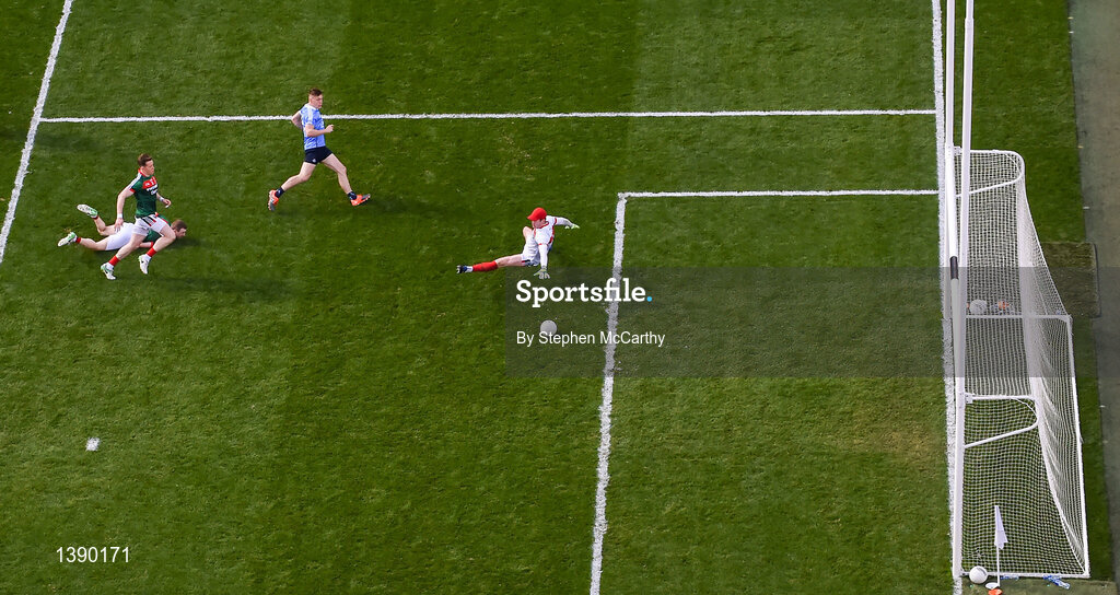 17 September 2017; Con O'Callaghan of Dublin shoots to score his side's first goal past Mayo goalkeeper David Clarke during the GAA Football All-Ireland Senior Championship Final match between Dublin and Mayo at Croke Park in Dublin. Photo by Stephen McCarthy/Sportsfile
