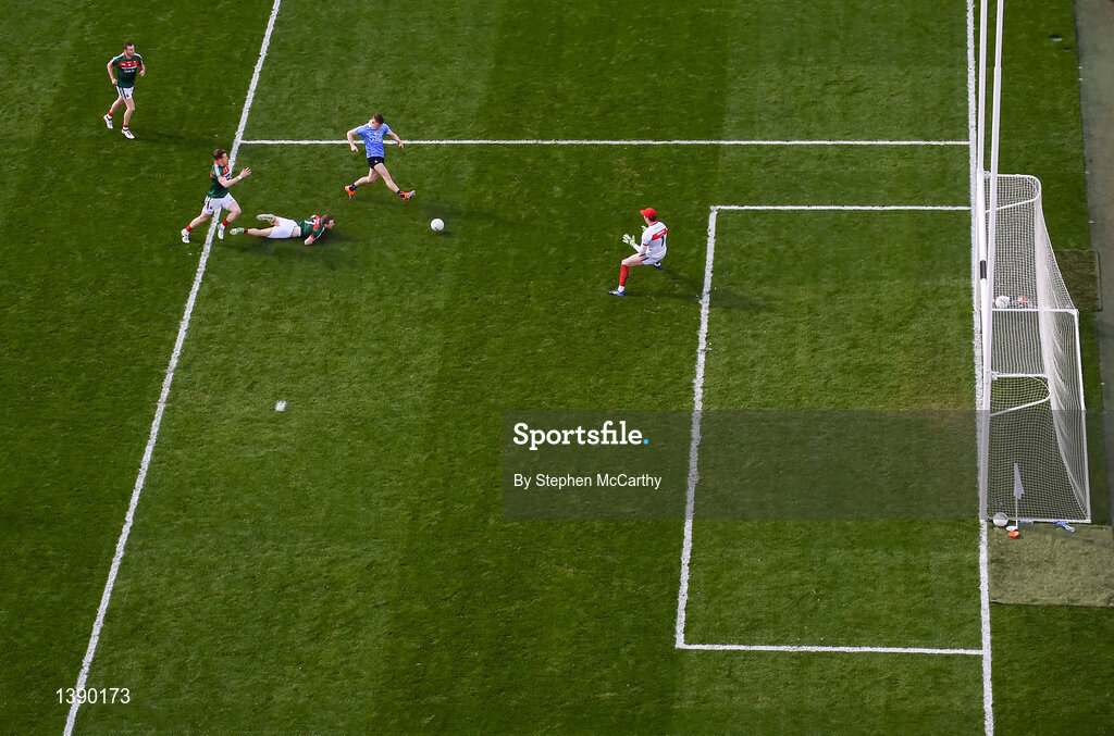 17 September 2017; Con O'Callaghan of Dublin shoots to score his side's first goal past Mayo goalkeeper David Clarke during the GAA Football All-Ireland Senior Championship Final match between Dublin and Mayo at Croke Park in Dublin. Photo by Stephen McCarthy/Sportsfile