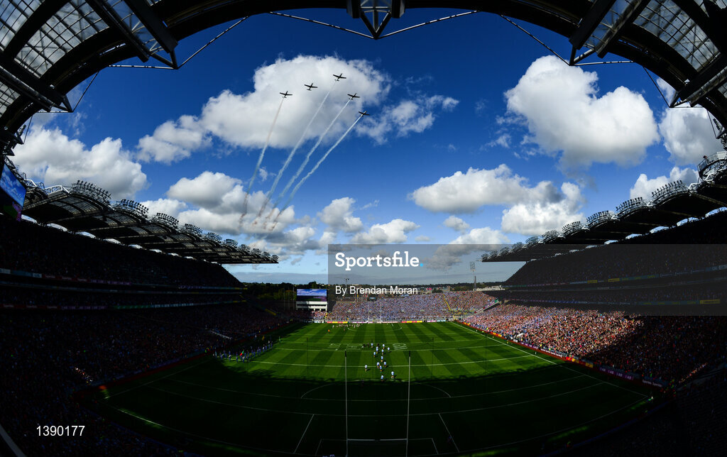 17 September 2017; Irish Air Corps aircraft perform a flypast Croke Park prior to the start of the GAA Football All-Ireland Senior Championship Final match between Dublin and Mayo at Croke Park in Dublin. Photo by Brendan Moran/Sportsfile