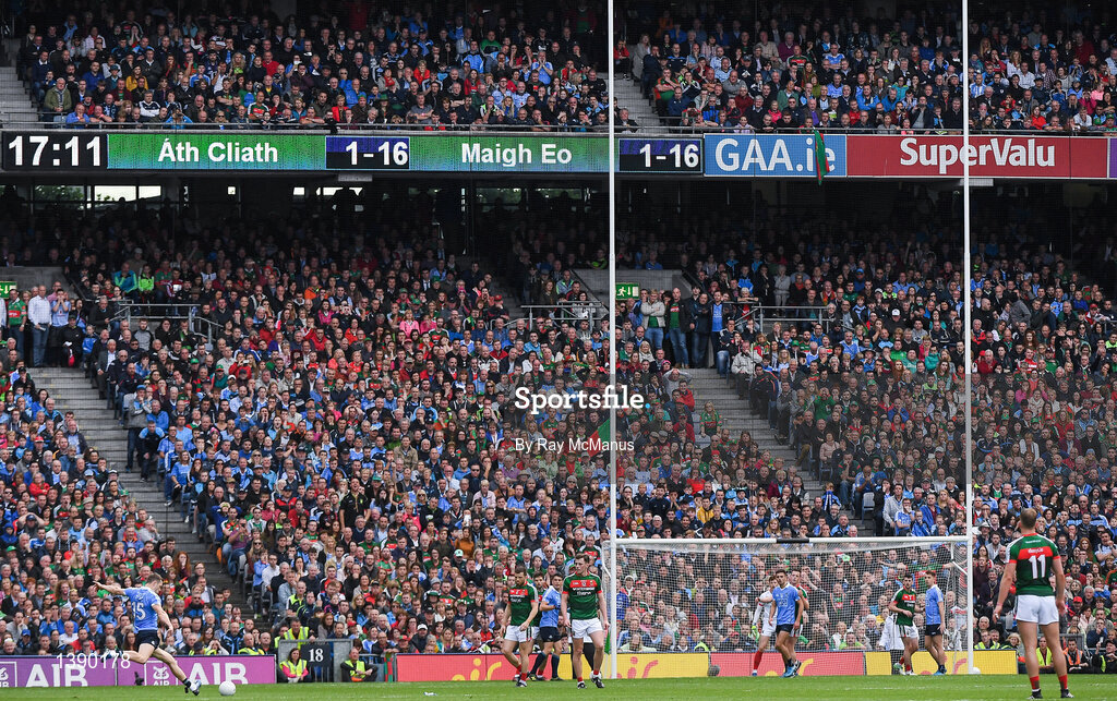 17 September 2017; Dean Rock of Dublin, left, kicks a last minute free to ultimately win the the GAA Football All-Ireland Senior Championship Final match between Dublin and Mayo at Croke Park in Dublin. Photo by Ray McManus/Sportsfile