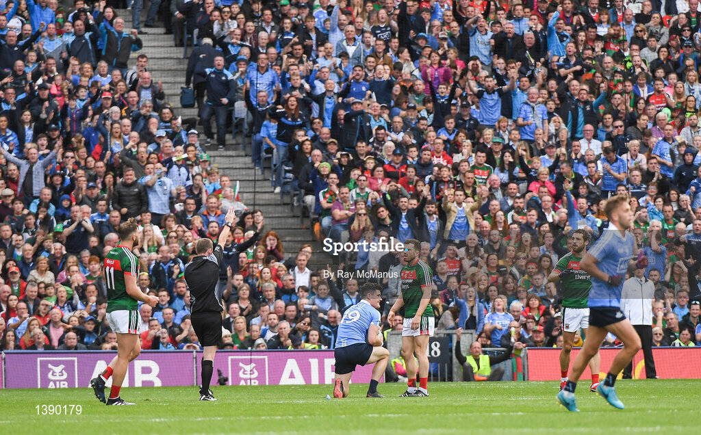 17 September 2017; Referee Joe McQuillan indicates a free for Dublin after Diarmuid Connolly, 19, had been fouled, by Chris Barrett, 6, of Mayo, in the last minute of GAA Football All-Ireland Senior Championship Final match between Dublin and Mayo at Croke Park in Dublin. Photo by Ray McManus/Sportsfile