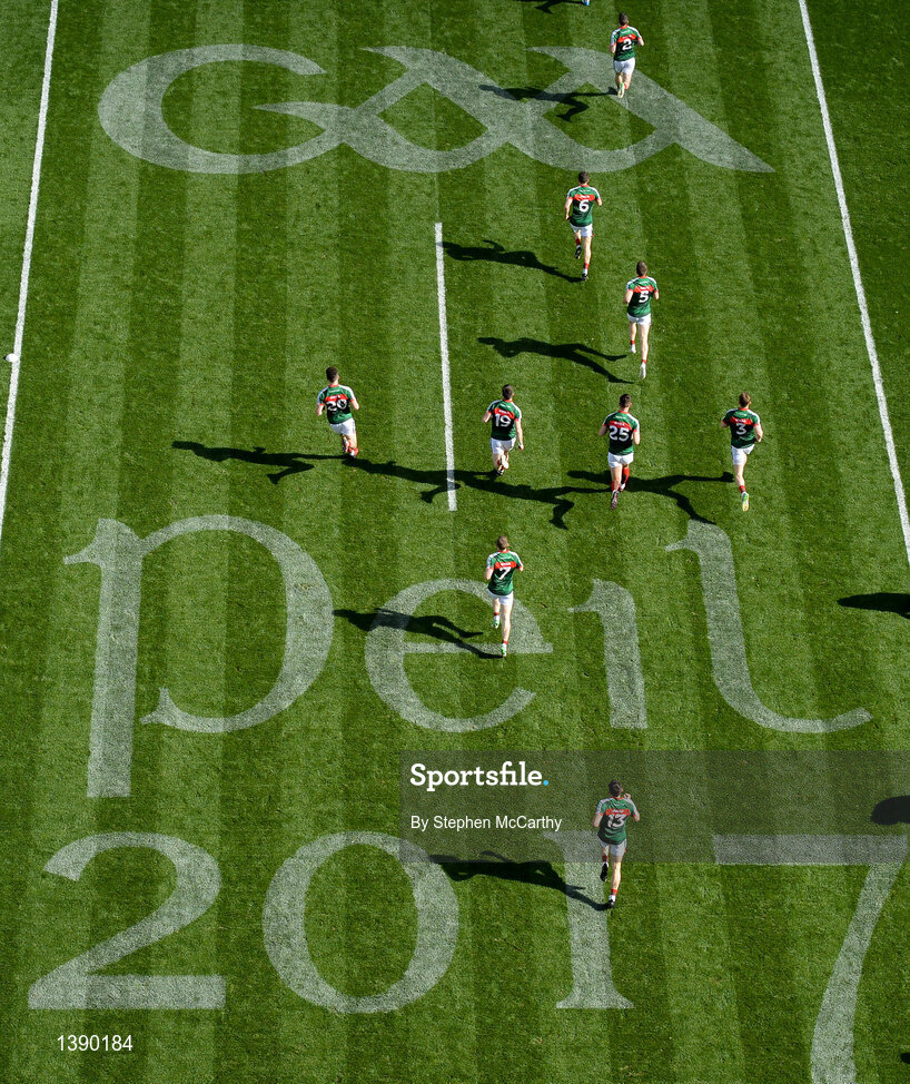 17 September 2017; Mayo players run out ahead during the GAA Football All-Ireland Senior Championship Final match between Dublin and Mayo at Croke Park in Dublin. Photo by Stephen McCarthy/Sportsfile