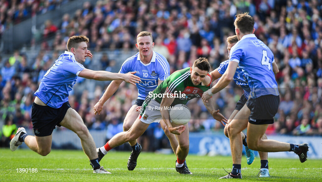 17 September 2017; Jason Doherty of Mayo is surrounded by Dublin players, from left, John Small, Ciarán Kilkenny, Jonny Cooper and Michael Fitzsimons during the GAA Football All-Ireland Senior Championship Final match between Dublin and Mayo at Croke Park in Dublin. Photo by Ray McManus/Sportsfile