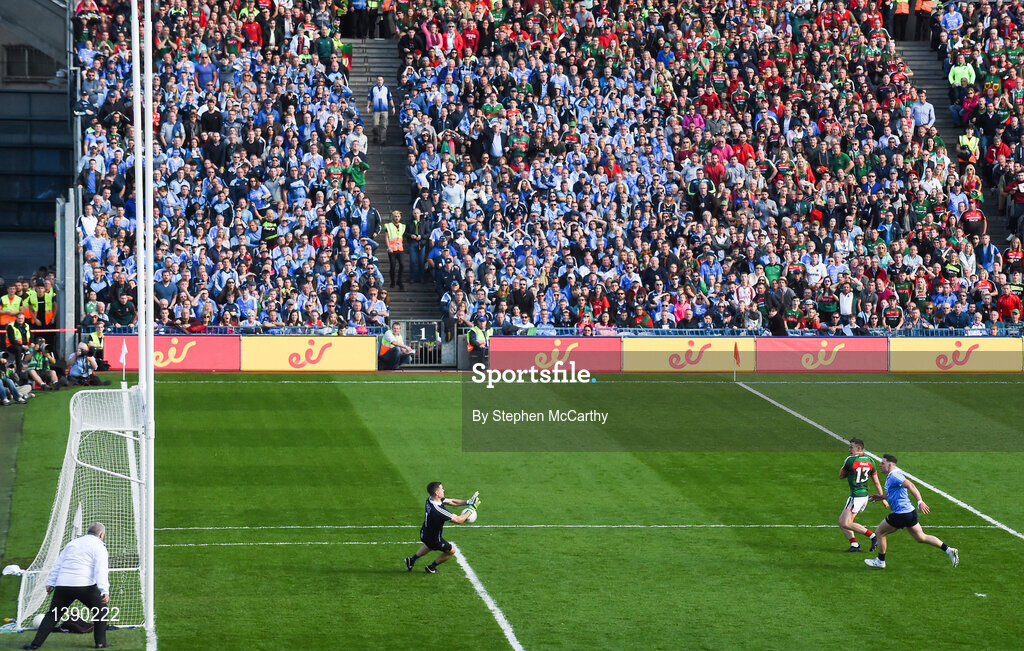 17 September 2017; Dublin goalkeeper Stephen Cluxton saves from Jason Doherty of Mayo during the GAA Football All-Ireland Senior Championship Final match between Dublin and Mayo at Croke Park in Dublin. Photo by Stephen McCarthy/Sportsfile