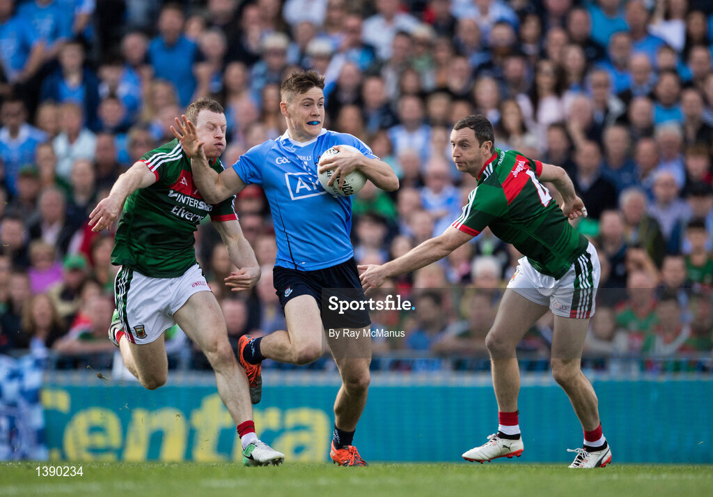 17 September 2017; Con O'Callaghan of Dublin evades the tackle of Colm Boyle, left, and Keith Higgins of Mayo on his way to scoring his side's goal in the first minute of the GAA Football All-Ireland Senior Championship Final match between Dublin and Mayo at Croke Park in Dublin. Photo by Ray McManus/Sportsfile