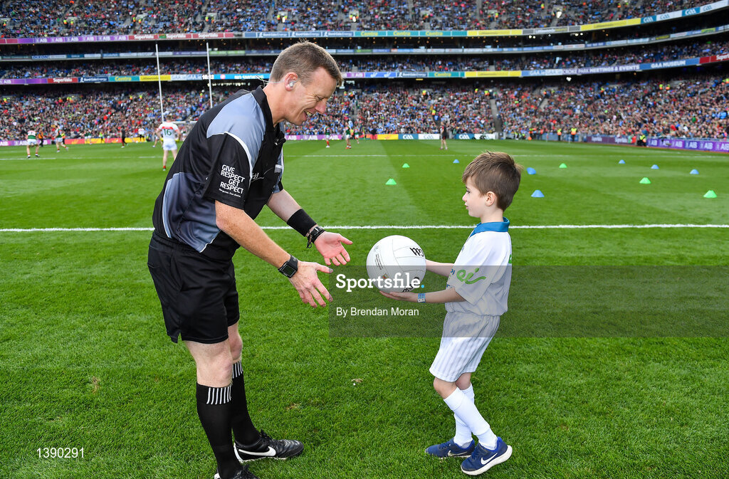 17 September 2017; Donnacha Judge, Culleens NS, Ballina, Co. Mayo, presents the official match ball to referee Joe McQuillan prior to the start of the GAA Football All-Ireland Senior Championship Final match between Dublin and Mayo at Croke Park in Dublin. Photo by Brendan Moran/Sportsfile