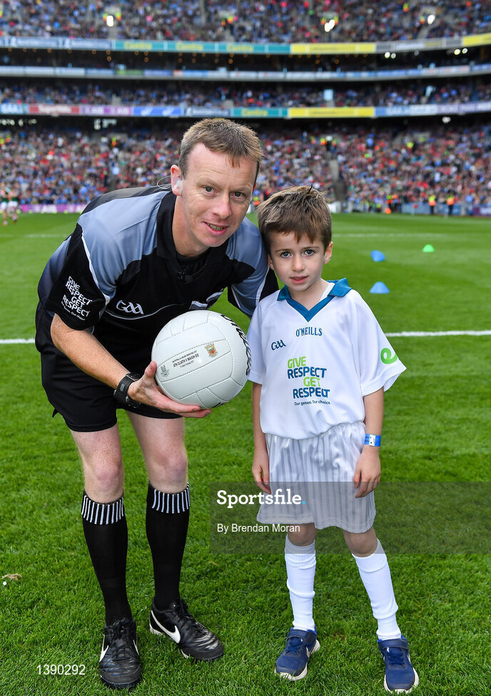 17 September 2017; Donnacha Judge, Culleens NS, Ballina, Co. Mayo, presents the official match ball to referee Joe McQuillan prior to the start of the GAA Football All-Ireland Senior Championship Final match between Dublin and Mayo at Croke Park in Dublin. Photo by Brendan Moran/Sportsfile