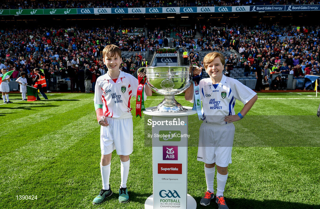 17 September 2017; Johnny Cummins, Gaelscoil Uileog De Búrca, Claremorris, Co Mayo, left, and Zachary Storey, Scoil Mhuire, Lucan, Dublin, bring the Sam Maguire Cup onto the pitch prior to the GAA Football All-Ireland Senior Championship Final match between Dublin and Mayo at Croke Park in Dublin. Photo by Stephen McCarthy/Sportsfile