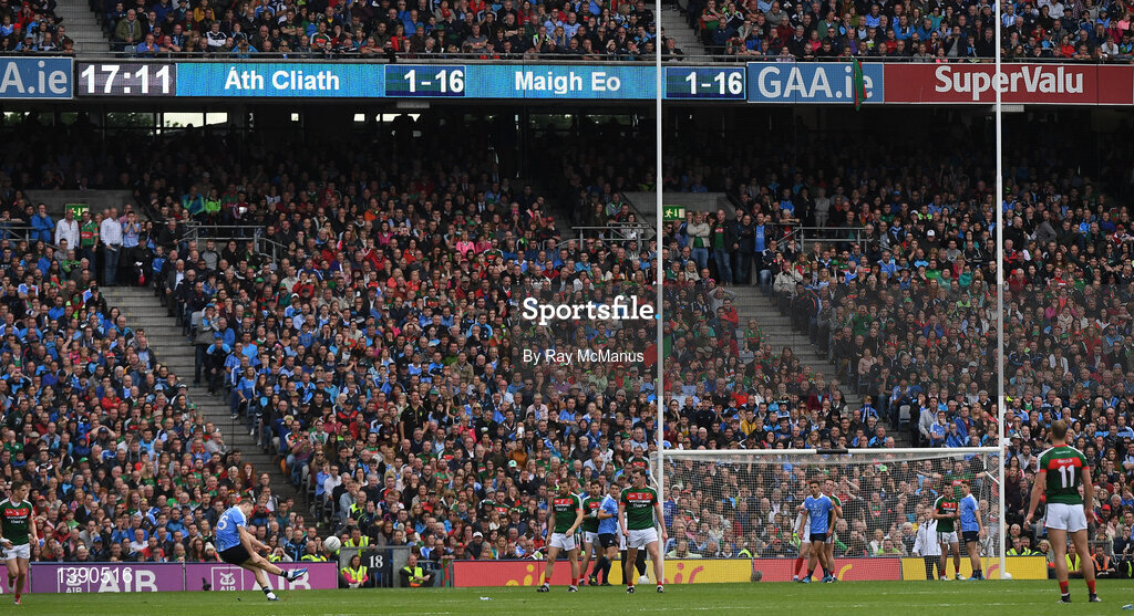 17 September 2017; Dean Rock of Dublin, second from left, kicks what proved to ber the winning point in the last minute of the GAA Football All-Ireland Senior Championship Final match between Dublin and Mayo at Croke Park in Dublin. Photo by Ray McManus/Sportsfile