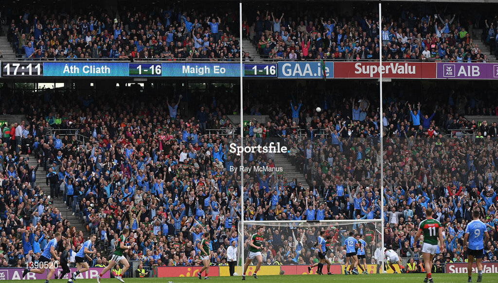 17 September 2017; Dean Rock of Dublin, second from left, celebrates after scoring what proved to be the winning point in the last minute of the GAA Football All-Ireland Senior Championship Final match between Dublin and Mayo at Croke Park in Dublin. Photo by Ray McManus/Sportsfile