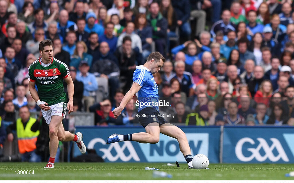 17 September 2017; Dean Rock of Dublin kicks his side's winning point, a free, as Lee Keegan of Mayo watches on during the GAA Football All-Ireland Senior Championship Final match between Dublin and Mayo at Croke Park in Dublin. Photo by Stephen McCarthy/Sportsfile