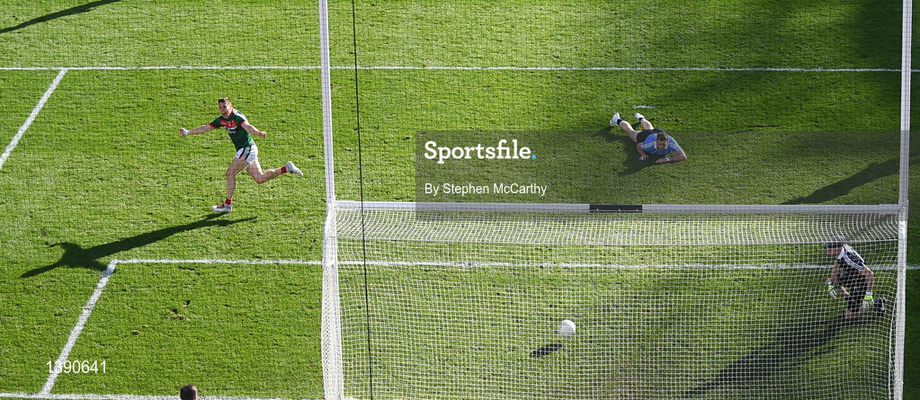 17 September 2017; Lee Keegan of Mayo celebrates after scoring his side's goal past Dublin goalkeeper Stephen Cluxton and defender Philip McMahon during the GAA Football All-Ireland Senior Championship Final match between Dublin and Mayo at Croke Park in Dublin. Photo by Stephen McCarthy/Sportsfile