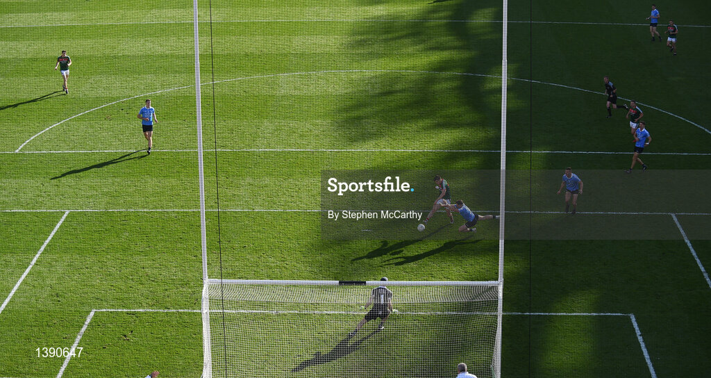 17 September 2017; Lee Keegan of Mayo shoots to score his side's goal past Dublin goalkeeper Stephen Cluxton and defender Philip McMahon during the GAA Football All-Ireland Senior Championship Final match between Dublin and Mayo at Croke Park in Dublin. Photo by Stephen McCarthy/Sportsfile