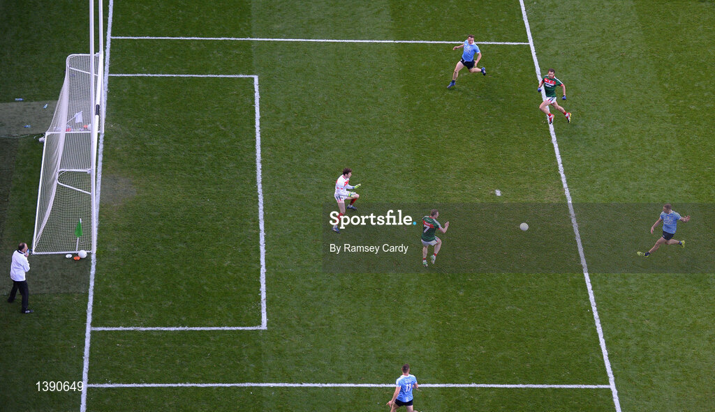 17 September 2017; Paul Mannion of Dublin has a shot on goal which was subsequently saved by Mayo goalkeeper David Clarke during the GAA Football All-Ireland Senior Championship Final match between Dublin and Mayo at Croke Park in Dublin. Photo by Ramsey Cardy/Sportsfile