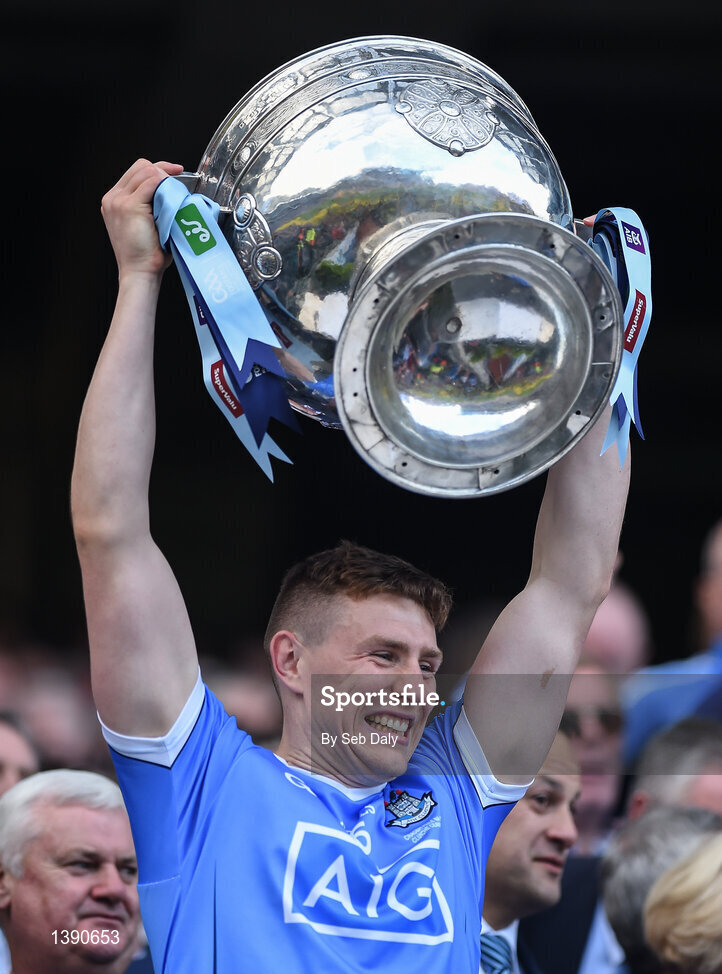 17 September 2017; John Small of Dublin celebrates with the Sam Maguire cup following his side's victory after the GAA Football All-Ireland Senior Championship Final match between Dublin and Mayo at Croke Park in Dublin. Photo by Seb Daly/Sportsfile