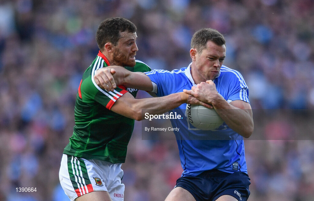 17 September 2017; Dean Rock of Dublin is tackled by Chris Barrett of Mayo during the GAA Football All-Ireland Senior Championship Final match between Dublin and Mayo at Croke Park in Dublin. Photo by Ramsey Cardy/Sportsfile