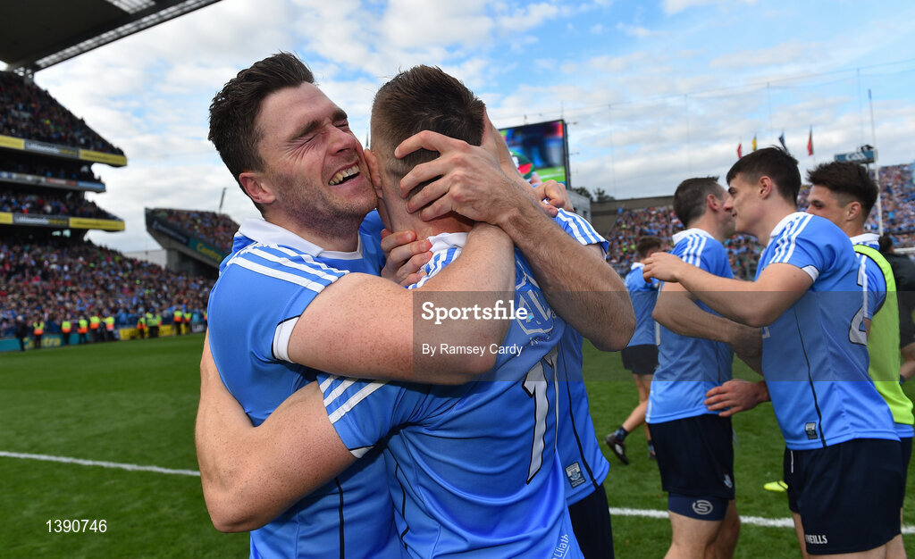 17 September 2017; Dublin's Paddy Andrews, left, and Con O'Callaghan celebrate following the GAA Football All-Ireland Senior Championship Final match between Dublin and Mayo at Croke Park in Dublin. Photo by Ramsey Cardy/Sportsfile