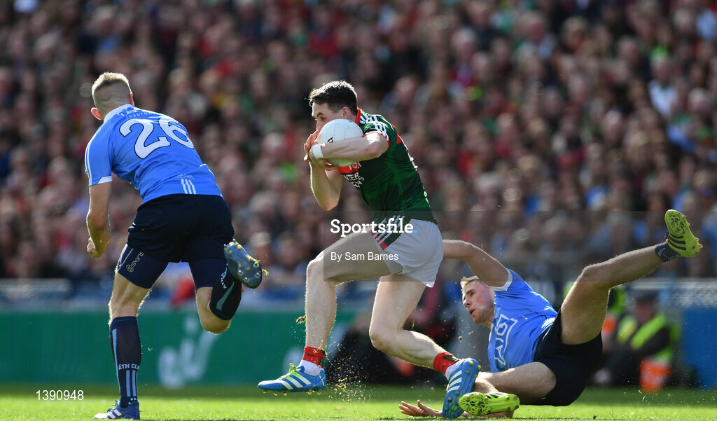 17 September 2017; Paddy Durcan of Mayo in action against Paul Mannion, right, and Eoghan O'Gara of Dublin during the GAA Football All-Ireland Senior Championship Final match between Dublin and Mayo at Croke Park in Dublin. Photo by Sam Barnes/Sportsfile