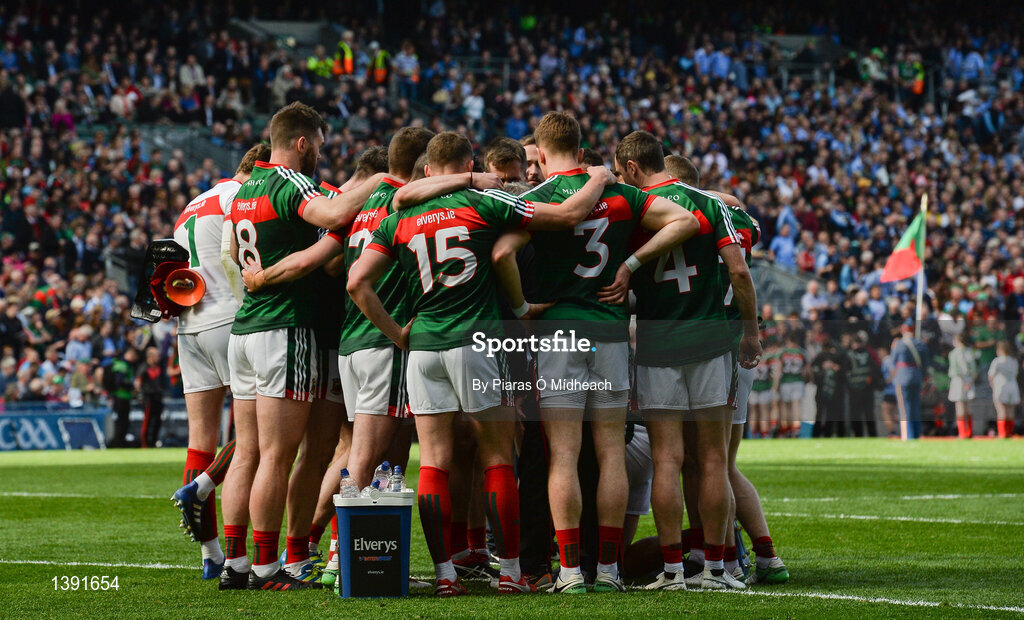 17 September 2017; Mayo players in a huddle before the GAA Football All-Ireland Senior Championship Final match between Dublin and Mayo at Croke Park in Dublin. Photo by Piaras Ó Mídheach/Sportsfile