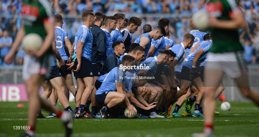 17 September 2017; The Dublin team break away after the pre-match team photograph as Mayo players warm up before the GAA Football All-Ireland Senior Championship Final match between Dublin and Mayo at Croke Park in Dublin. Photo by Piaras Ó Mídheach/Sportsfile