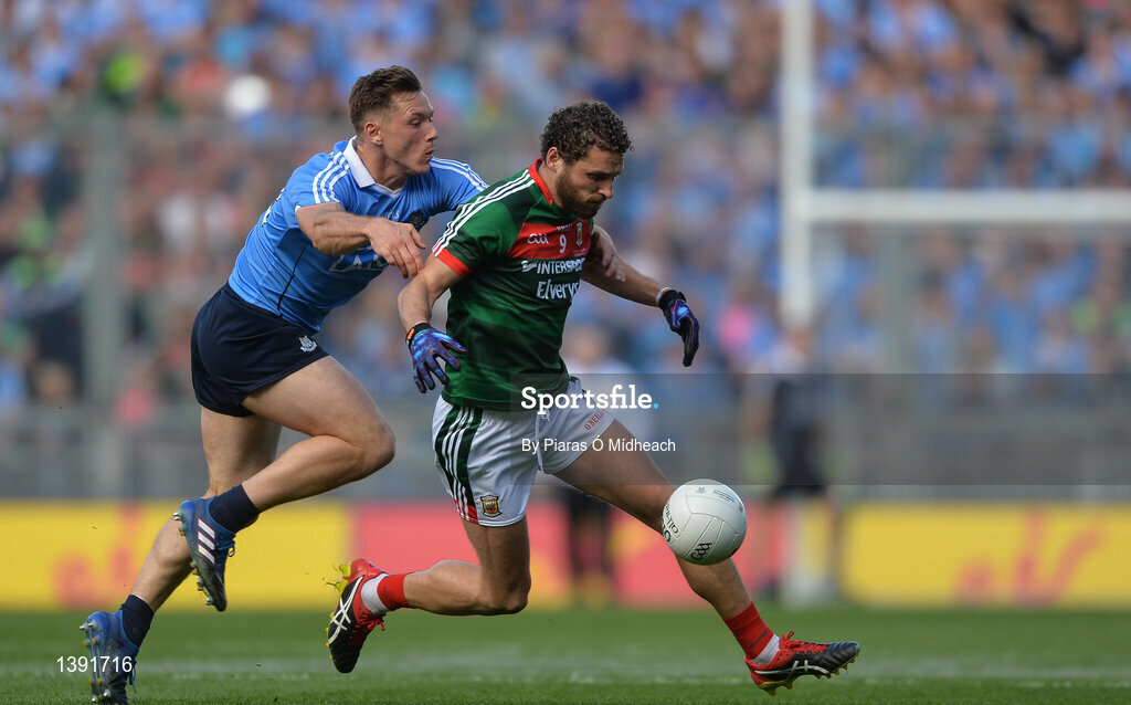 17 September 2017; Tom Parsons of Mayo in action against Paul Flynn of Dublin during the GAA Football All-Ireland Senior Championship Final match between Dublin and Mayo at Croke Park in Dublin. Photo by Piaras Ó Mídheach/Sportsfile